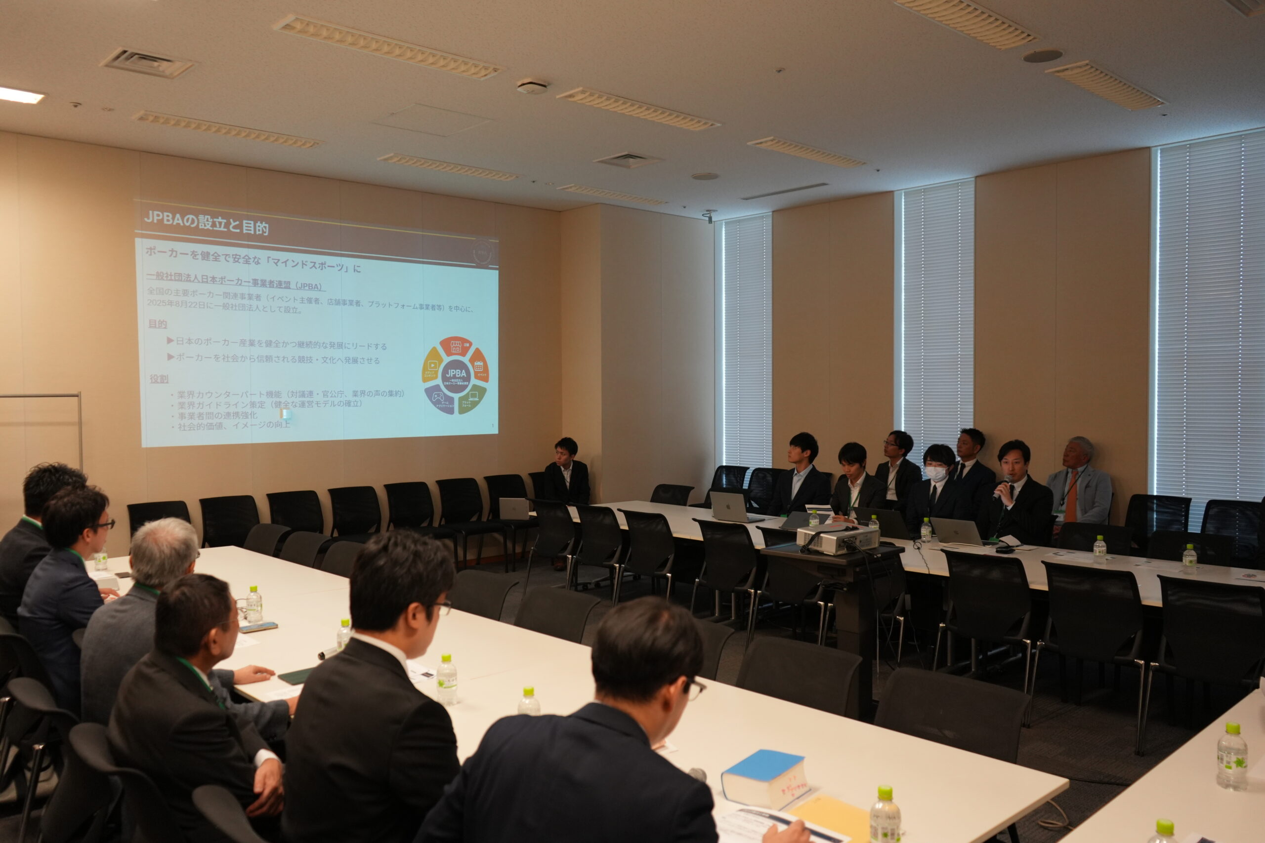 ポーカーが有する社会的価値や、業界健全化のための基盤整備マイルストン、業界ガイドライン策定プロセスなどについて説明・報告を行いました。
